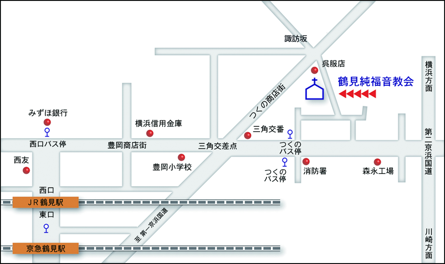 - 電車・徒歩の場合 ☆JR京浜東北線鶴見駅西口を出て、豊岡通りを北へ 三角(みかど)交差点から「レアールつくの」商店街アーケードを抜け右折 徒歩約15分。